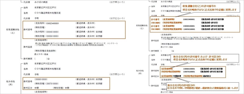 改修前は収集運搬会社(乙)と処分会社(丙)の許可番号部分の表示を略称で表示していましたが、改修後は同部分を建廃協様式の紙面契約書の文言と統一し、正式名称の表示に変更します。また、処分会社(丙)の許可区分においては、「中間」や「最終」であった表示を「中間処理」と「最終処分」に変更します。尚、作成画面上での文言変更はありません。 変更箇所は下記の画像(左:改修前、右:改修後)にてご確認ください。