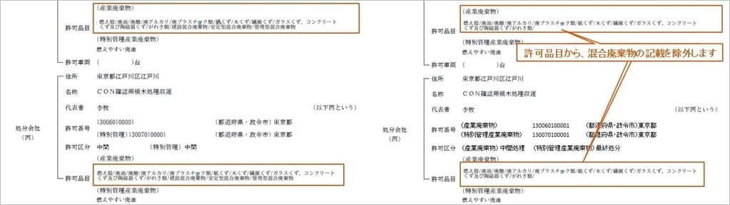 「混合廃棄物」は許可証記載の許可品目ではないため改修後は契約書PDFの許可品目には表示されなくなります。【対象】