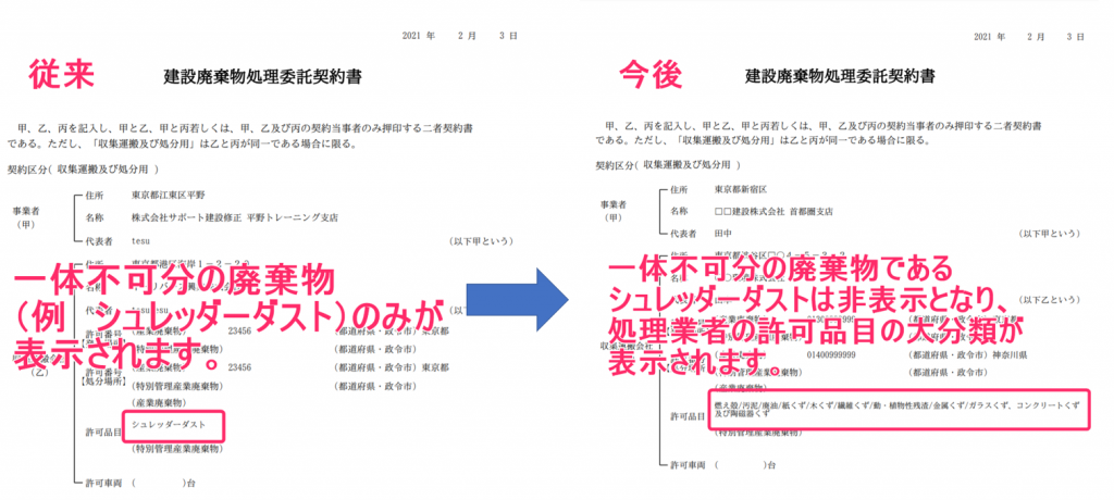 ■一体不可分の産業廃棄物を契約品目とした場合、契約書PDFの許可品目で一体不可分の産業廃棄物を表示しないようにします 【対象ユーザ】 排出事業者 収集運搬業者 処分業者 【概要】 契約書PDF出力において、収集運搬会社(乙)の許可品目に一体不可分の廃棄物を表示しないようにします。また、処分会社(丙)の許可品目についても同様です。 ※一体不可分の廃棄物には、以下の大分類の廃棄物とその中・小分類の廃棄物が含まれます。 大分類:シュレッダーダスト、廃自動車、廃電気機械器具、廃電池類、複合材 【対象】 建設廃棄物処理委託契約書 全産連委託契約書 【詳細】 改修前は収集運搬会社(乙)と処分会社(丙)の許可品目に「シュレッダーダスト」のように一体不可分の廃棄物を表示していましたが、改修後は表示されなくなります。 許可品目にはその内容物となる燃え殻や汚泥等の20種の大分類名が表示されます。 変更箇所は下記の画像(左:改修前、右:改修後)にてご確認ください。