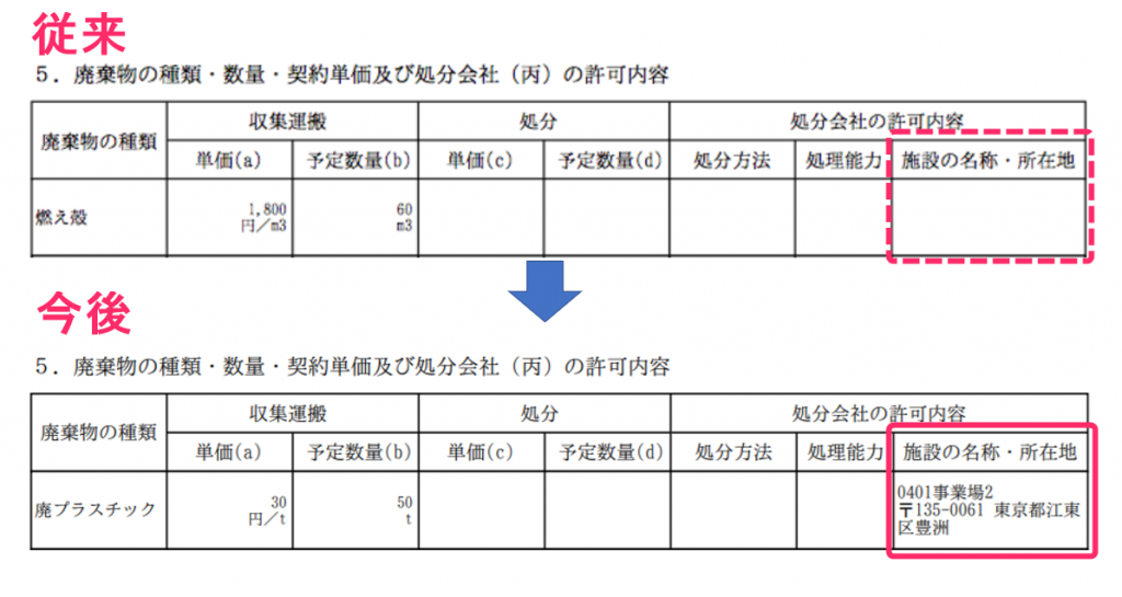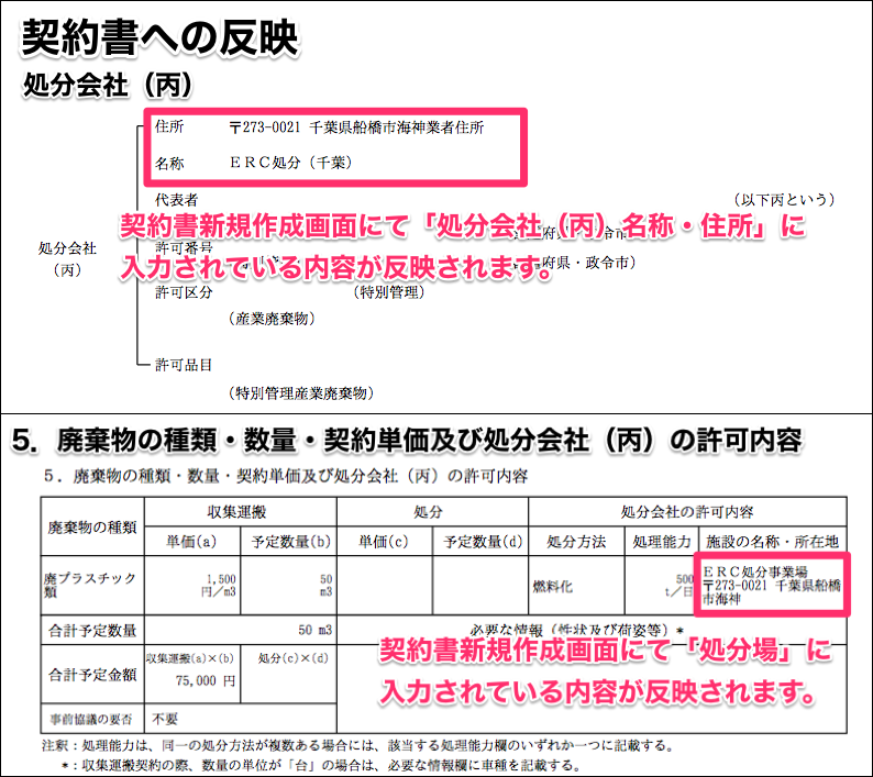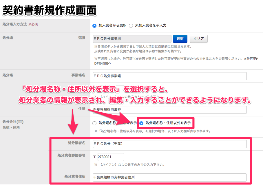 ・運搬契約の場合も、処分業者と処分場の名称・住所を別々に登録できるようになります