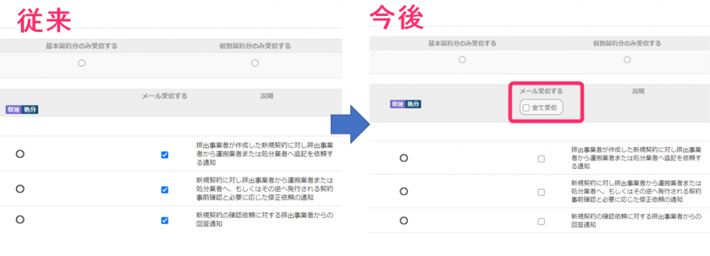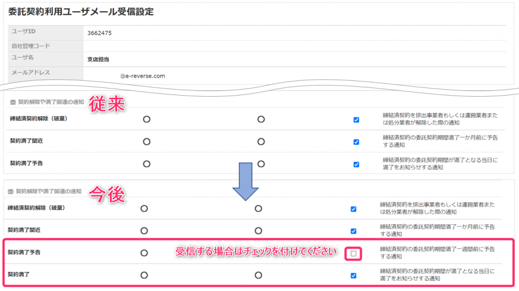 ■契約満了の1週間前にメールを通知するようになります 【対象ユーザ】 排出事業者 収集運搬業者 処分業者 【概要】 契約満了の1週間前に契約が満了となる旨を予告するメールを通知するようになります。 【詳細】 改修前は契約満了の1か月前に契約が満了となる旨を予告するメールを通知していましたが、改修後は1か月前の通知に加えて、契約満了1週間前にもメールを通知します。 委託契約利用ユーザのメール受信設定で通知を受信する設定に変更することでメールが届くようになります。 変更箇所は下記の画像(上:改修前、下:改修後)にてご確認ください。
