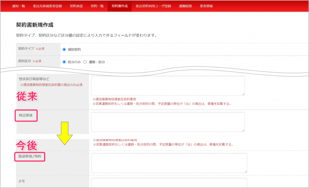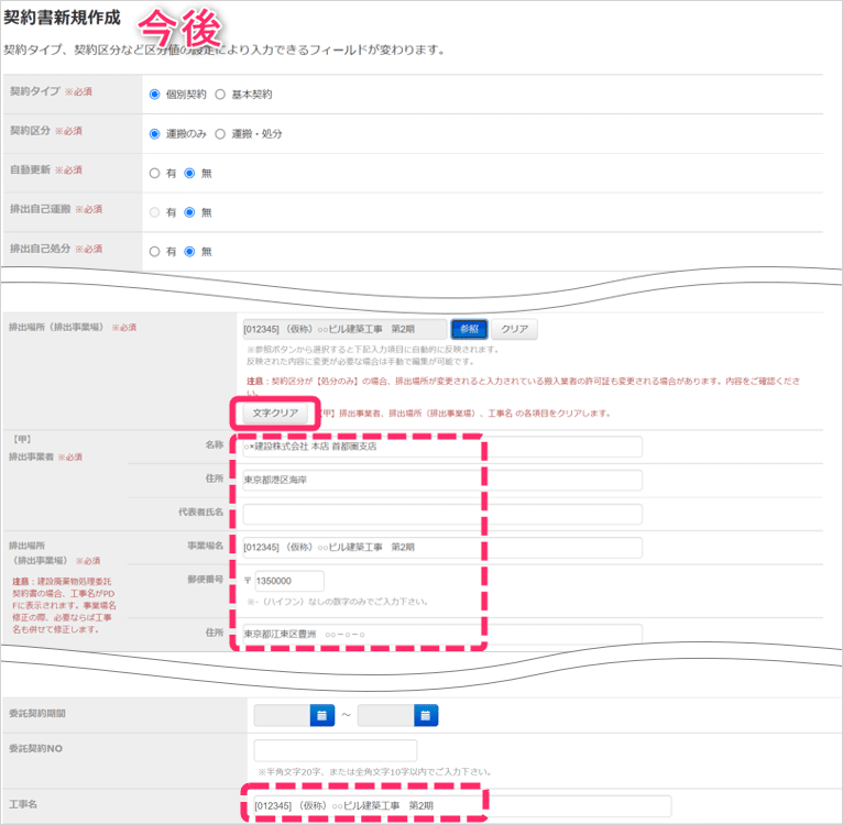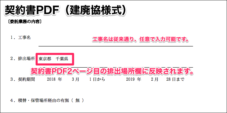 従来、基本契約の場合、契約書PDFにおける排出場所は画面からの入力は行えず、常に空白で表示されていました。 今回の改修では基本契約の場合、画面上で排出場所を入力できるようになり、建廃協様式の契約書PDFにも反映されるようになりました。【詳細】
