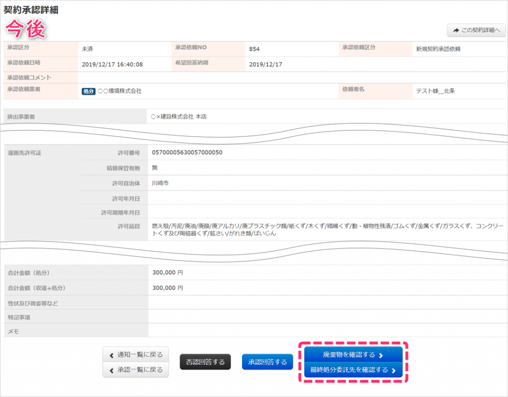 また、契約承認詳細画面最下部に【廃棄物を確認する】と【最終処分委託先を確認する】のボタンが表示されるようになり、契約書の詳細な情報が確認しやすくなります。