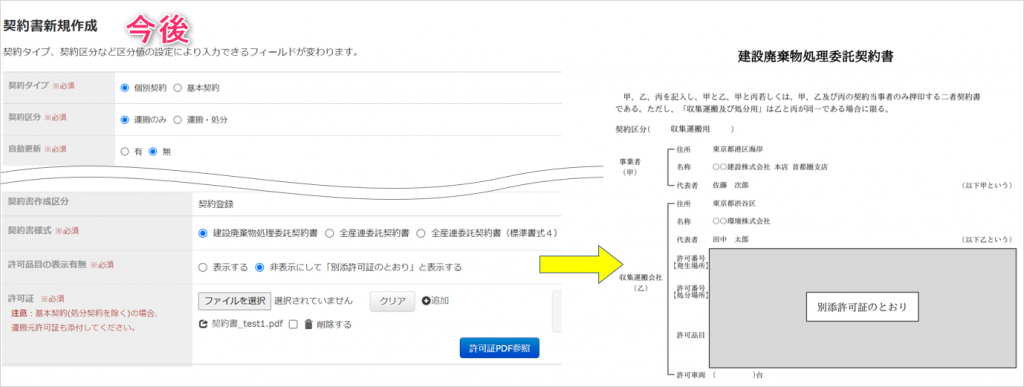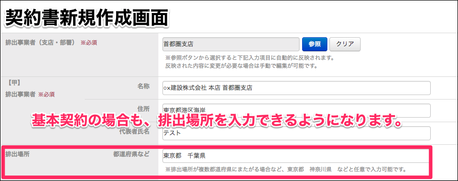 ・基本契約の場合も、排出場所を入力できるようになり、契約書PDFに反映されるようになります