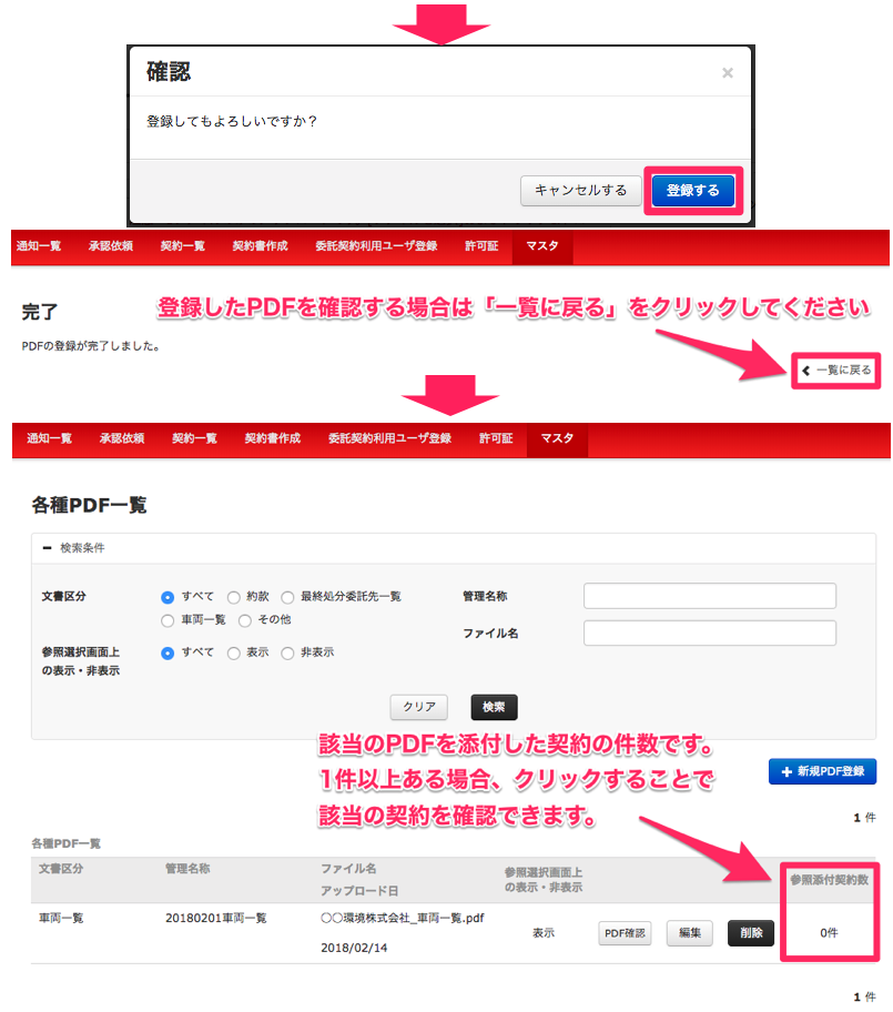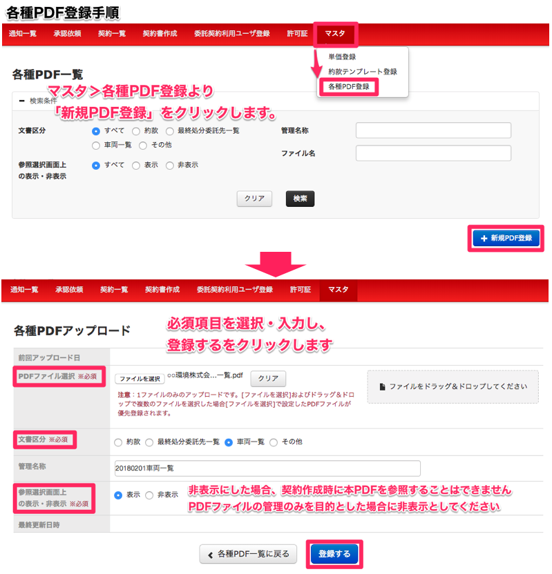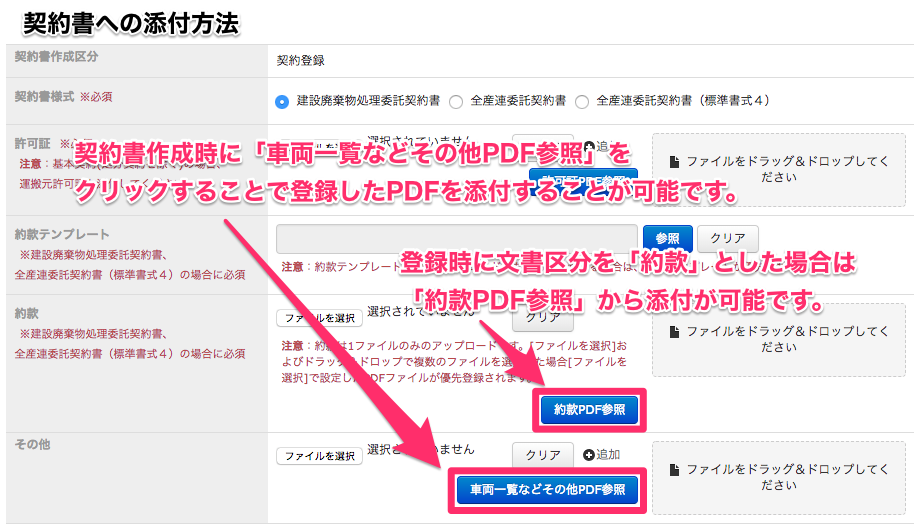 従来、許可証以外の各種資料(約款PDF、車両一覧、最終処分委託先etc)を契約に添付する場合、 契約作成の度に、操作している方のパソコン内や部門などの共有フォルダに保管している PDFファイルを探して、添付するという操作が必要でした。 この手間を軽減するために以下の機能を追加しました。 ・約款PDF、車両一覧などの契約で添付する可能性がある各種資料をPDFとしてアップロード・管理する ・アップロードした各種PDFを契約作成時に簡単に見つけて添付可能にする【詳細】