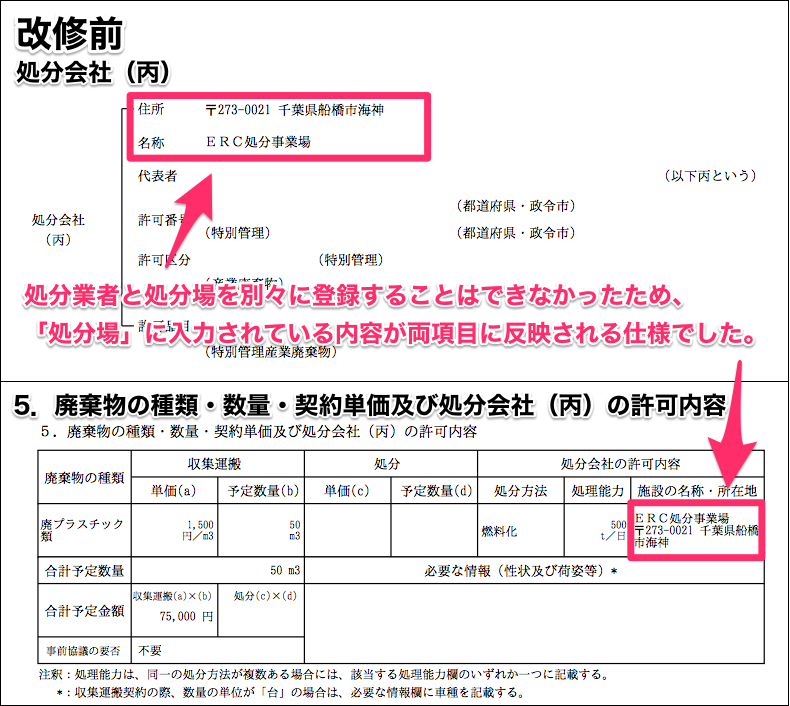 従来、運搬契約では処分業者は契約当事者ではないため、運搬先としての処分場の名称・住所のみ登録可能でした。 そのため建廃協様式の場合、契約書の1ページ丙の部分および『5.廃棄物の種類・数量・契約単価及び処分会社(丙)の許可内容』に 同じ処分場名称・住所が印字されるようになっています。 ※処分契約、運搬・処分契約の場合は、処分業者の名称、住所と実際に処理を行う処分場(処理施設)の名称、住所を別々に登録する事が可能です。 今回の改修では、運搬契約の場合も処分業者の名称・住所と処分場の名称・住所を別々に登録できるようにします。 このことにより契約書の1ページ丙の部分および『5.廃棄物の種類・数量・契約単価及び処分会社(丙)の許可内容』に異なる名称、住所を印字する事が可能となります。【詳細】