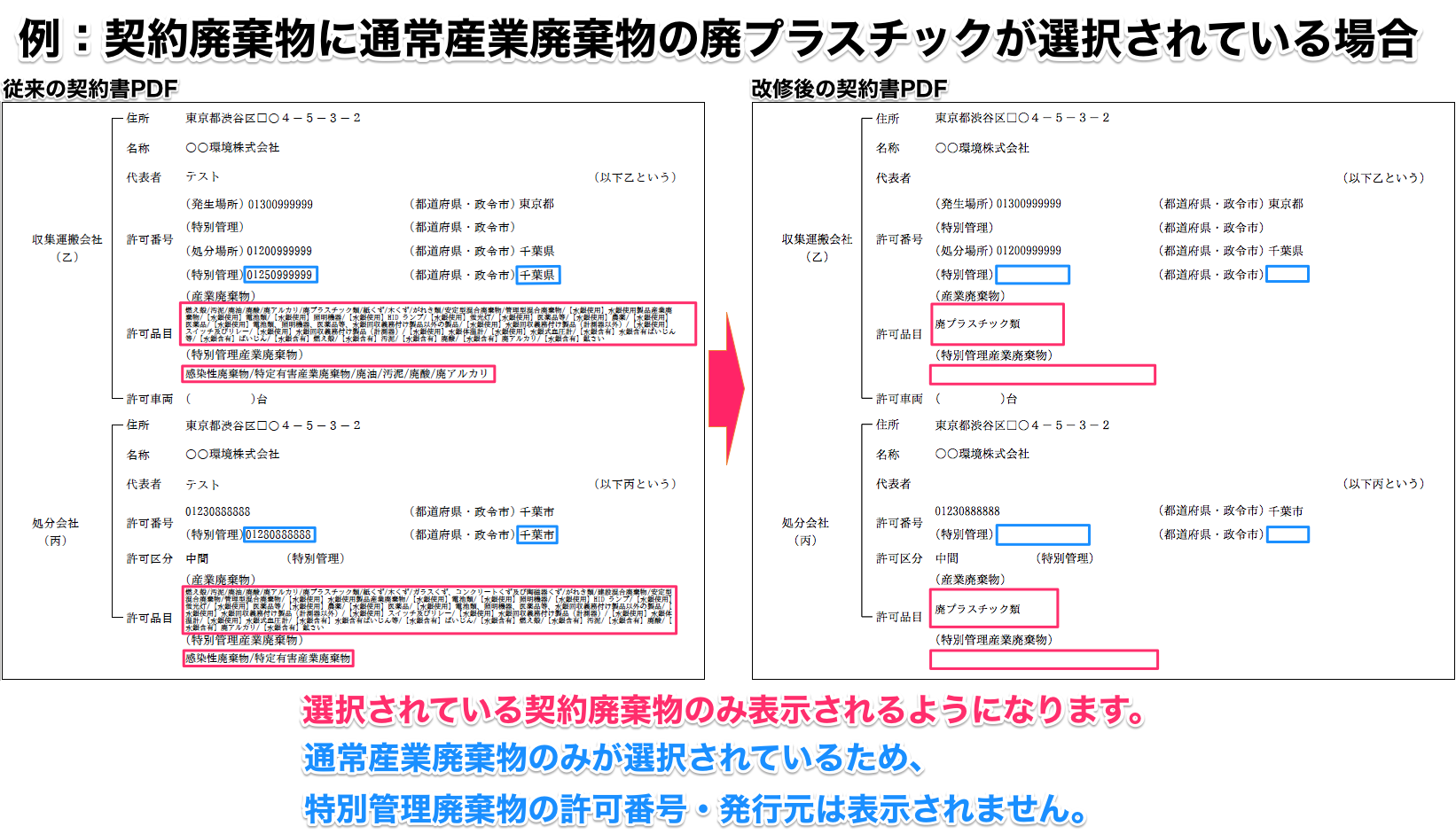 ・契約書PDFの許可品目欄には、契約廃棄物に関わる許可廃棄物と許可証情報のみを表示するようになります