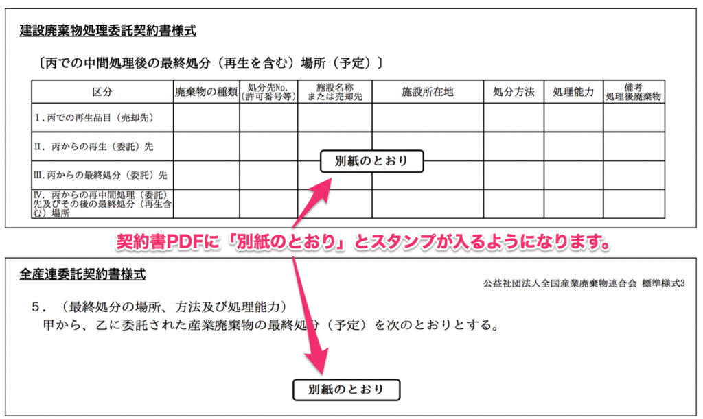 ・最終処分委託先をPDFで添付した場合、契約書PDFに「別紙のとおり」とスタンプが入るようになります