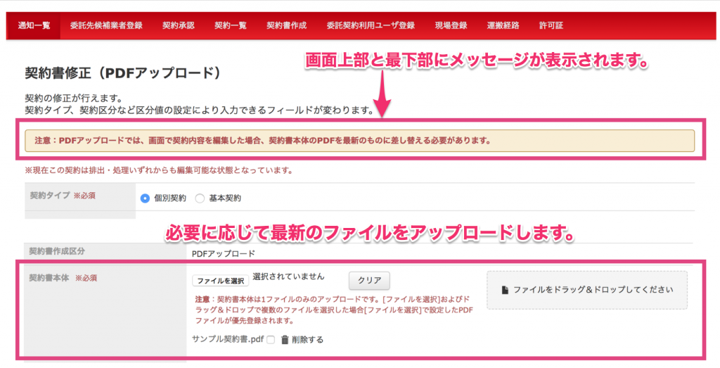 ・PDFアップロード版の契約修正画面において注意喚起メッセージが表示されるようになります