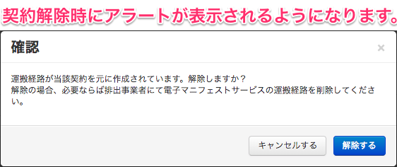 契約解除時にe-reverse.comに連携した運搬経路がある場合は、アラートを表示します。 アラートが表示された場合、排出事業者にてe-reverse.comの運搬経路を削除していただくことで、 契約書と電子マニフェストの整合性を保つことができます。【詳細】