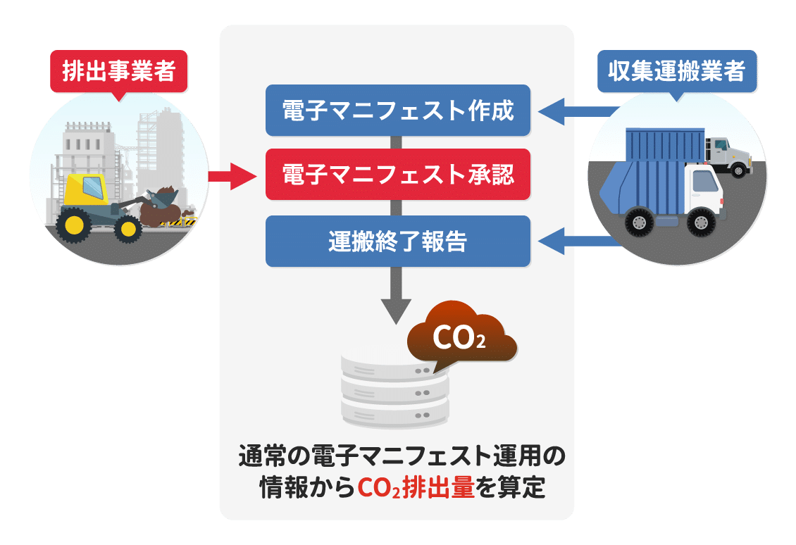 電子マニフェストサービス『e-reverse.com』に入力した情報を利用し自動算定するため、産業廃棄物の輸送に関わるCO₂排出量を効率的に算出できます。※