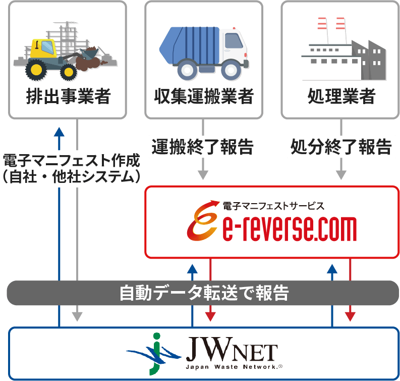 JWNETデータ取込機能とは、e-reverse.comを介さないで登録されたマニフェストデータを、JWNETから自動で取込み、全ての電子マニフェストデータをe-reverse.comの画面上で一元的に操作、管理ができる収集運搬業者様、処分業者様向けの有料オプション機能です。排出事業者様が利用する電子マニフェストシステムに合わせて、複数の運用方法を用意する必要がなくなりますので業務の効率化を図れます。