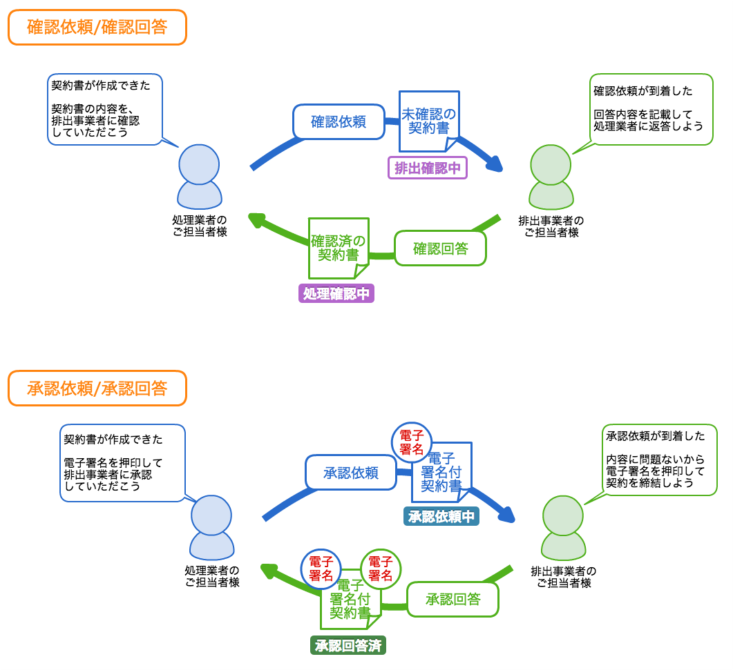 | 確認依頼 / 確認回答 | 新規契約締結前および契約変更締結前に 契約書の内容を双方で確認する行為 |