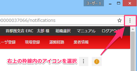 1. Google Chromeの画面右上 枠線内のアイコンを選択し「設定」を選択します。