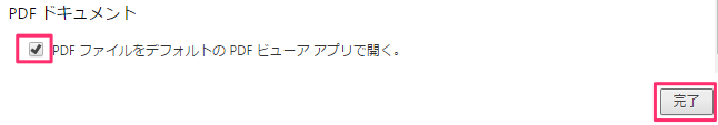 3. コンテンツの設定画面の「PDF ドキュメント」にて「PDFファイルをデフォルトのPDFビューアアプリで開く。」にチェックを入れ「完了」を選択します。