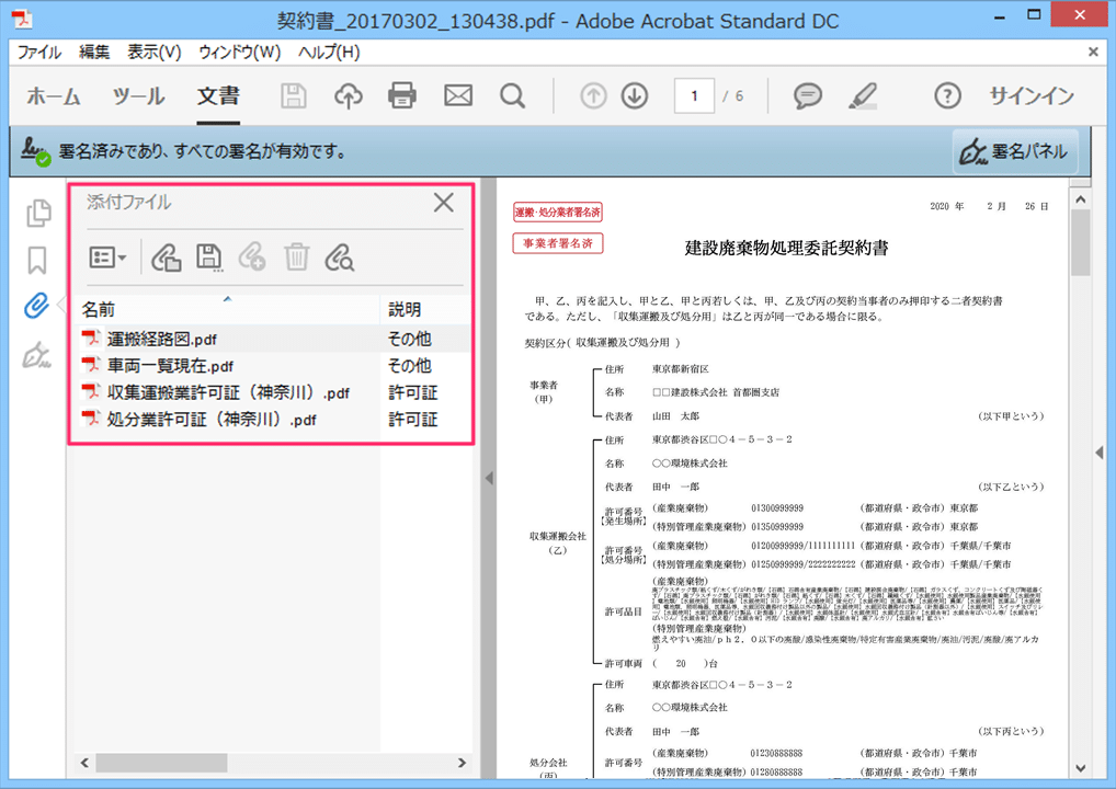 以下のように契約書に添付された許可証PDFや、その他項目で添付されたPDF(車両一覧など)