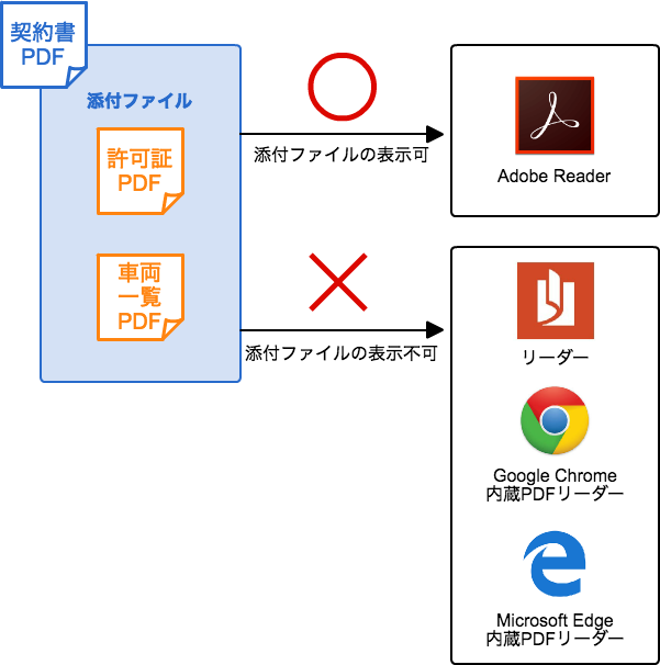 契約書PDFの添付ファイルは以下のように「Adobe Reader」でのみ閲覧が可能です。