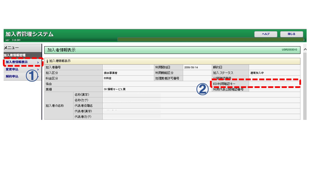 なお「加入者情報表示」ページでは加入者番号や公開確認番号(収集運搬・処分業者のみ)も確認できます。
