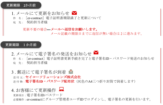 電子署名は2年ごとに更新のお手続きが必要です。以下、お手続きの流れをご説明いたします。
