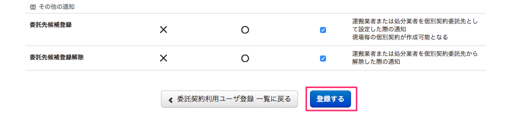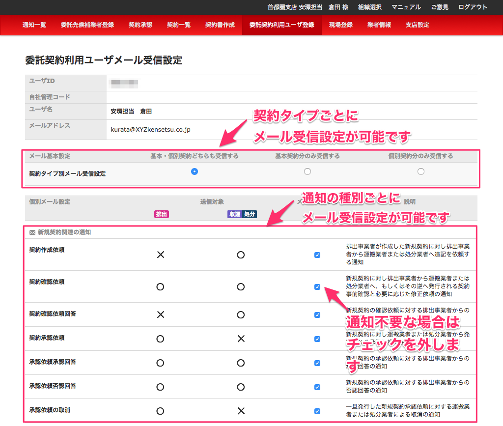 6.「委託契約利用ユーザメール受信設定」画面で受信希望の契約タイプと受信希望のメールの項目にチェックする。