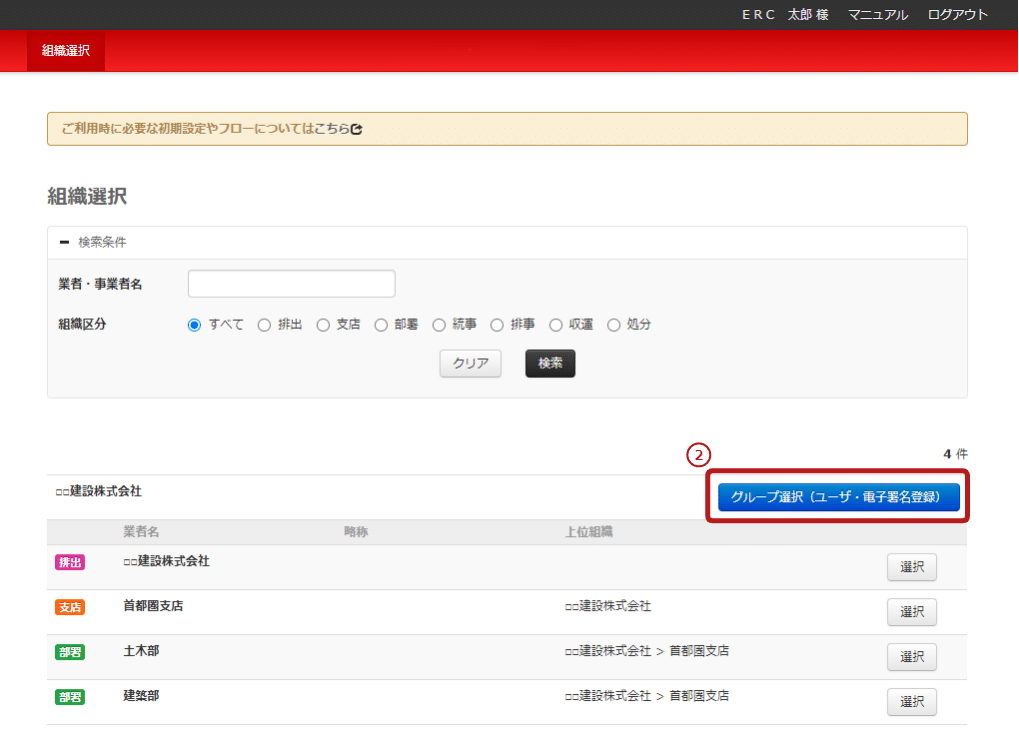 2.「組織選択」画面で青い「グループ選択(ユーザ・電子署名登録)」を押す。