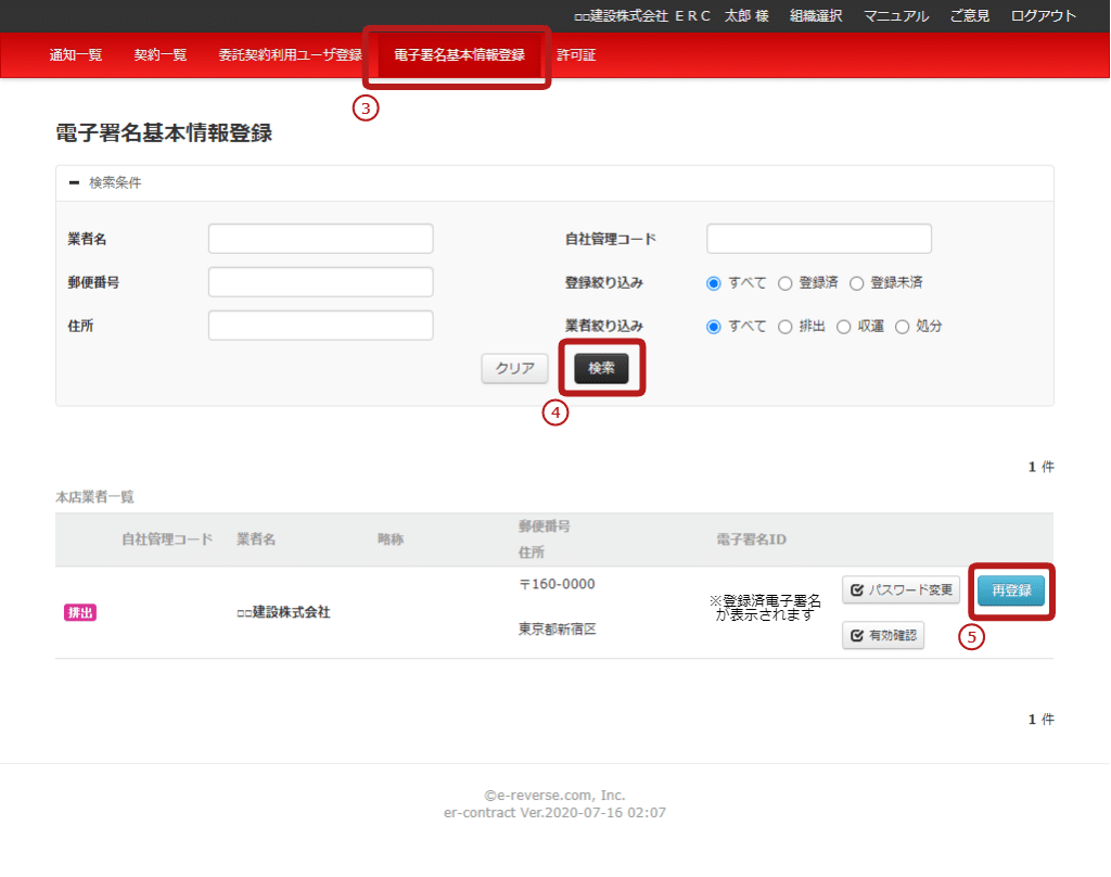 5.「本店業者一覧」に表示された業者から更新したい業者の「再登録」を押す。