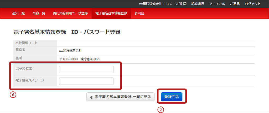 6.「電子署名基本情報登録ID・パスワード登録」画面で「電子署名ID」、「電子署名パスワード」を入力する。